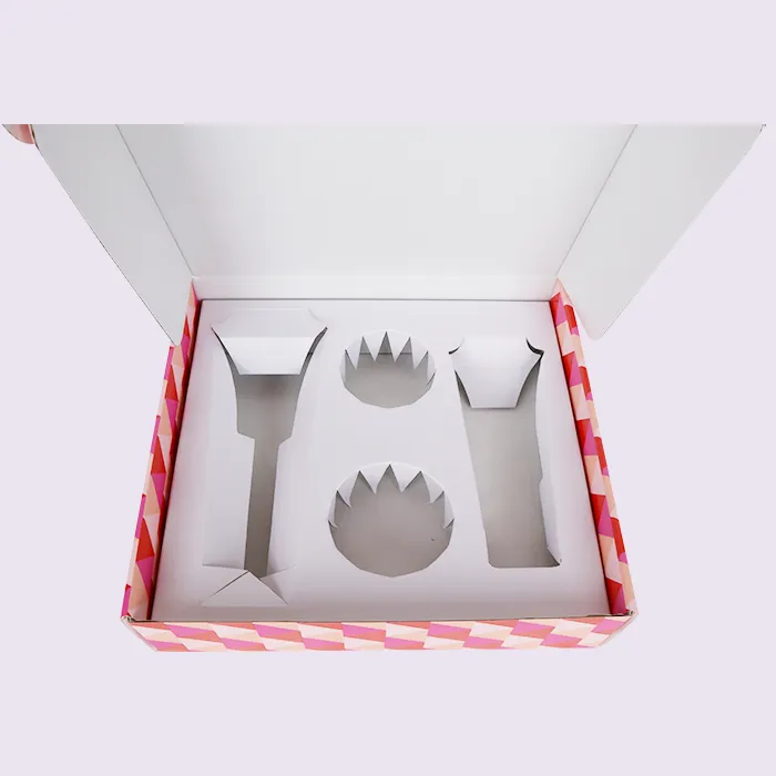 پیکیجنگ داخل کرنے کے لیے، ہم نے کئی مواد پر غور کیا: کاغذ، پلاسٹک، فوم، اور ماحول دوست مولڈ انسرٹ۔ آخر کار، ہم نے ان کی کم قیمت، تیز رفتار ٹرناراؤنڈ ٹائم، سادگی، اور ماحول دوست، بایوڈیگریڈیبل نوعیت کے لیے ری سائیکل کیے جانے کے قابل کاغذ کے داخلوں کا انتخاب کیا۔ پرسنل کیئر شپنگ بکس کے لیے کاغذی داخلوں کو حسب ضرورت سانچوں کی ضرورت نہیں ہوتی، اس لیے مولڈ فیس کی ضرورت نہیں ہے۔ Doyoupack کے پیکیجنگ ڈیزائنرز نمونے کی بنیاد پر طول و عرض، سلاٹس، ٹیبز اور انٹر لاکنگ فیچرز کو اپنی مرضی کے مطابق فٹ کرتے ہیں، اور پھر ڈائی کٹنگ کے ذریعے انسرٹ تیار کرتے ہیں۔ کاغذ داخل کرنا ایک ایک ٹکڑا نالیدار مواد ہے — لاگت سے موثر، مکمل طور پر بایوڈیگریڈیبل، اور انتہائی ماحول دوست۔ یہ نہ صرف مصنوعات کو اچھی طرح سے ظاہر کرتا ہے بلکہ مدد اور تحفظ بھی فراہم کرتا ہے۔ سب سے اہم بات یہ ہے کہ یہ ایکو مولڈ انسرٹس، پلاسٹک انسرٹس، یا گرے بورڈ انسرٹس کے مقابلے پروڈکٹ سیٹ کے مجموعی وزن کو نمایاں طور پر کم کرتا ہے۔ ایک ٹکڑا نالیدار داخل اور ایک ٹکڑا پرسنل کیئر شپنگ بکس بھی فلیٹ ٹرانسپورٹ کی سہولت فراہم کرتے ہیں۔