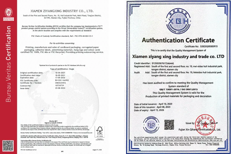 A: ہمارے پاس FSC, FDA, SGS, VOC اور ماحولیاتی ضوابط جیسے RoHS, 94/62/EC، اور US TPCH کی تعمیل ہے۔ ہماری فیکٹری کے پاس ISO9001 سرٹیفیکیشن ہے، بطور معروف بین الاقوامی پیکیجنگ سپلائر اور برآمد کنندہ۔